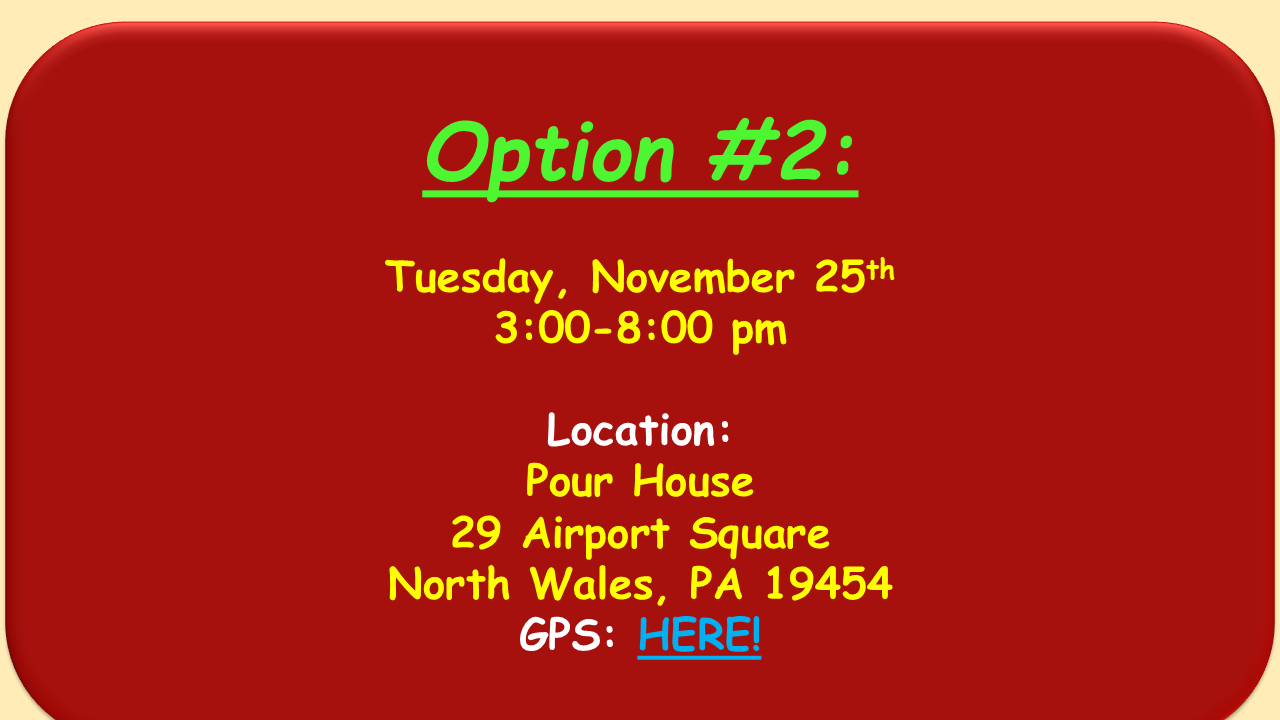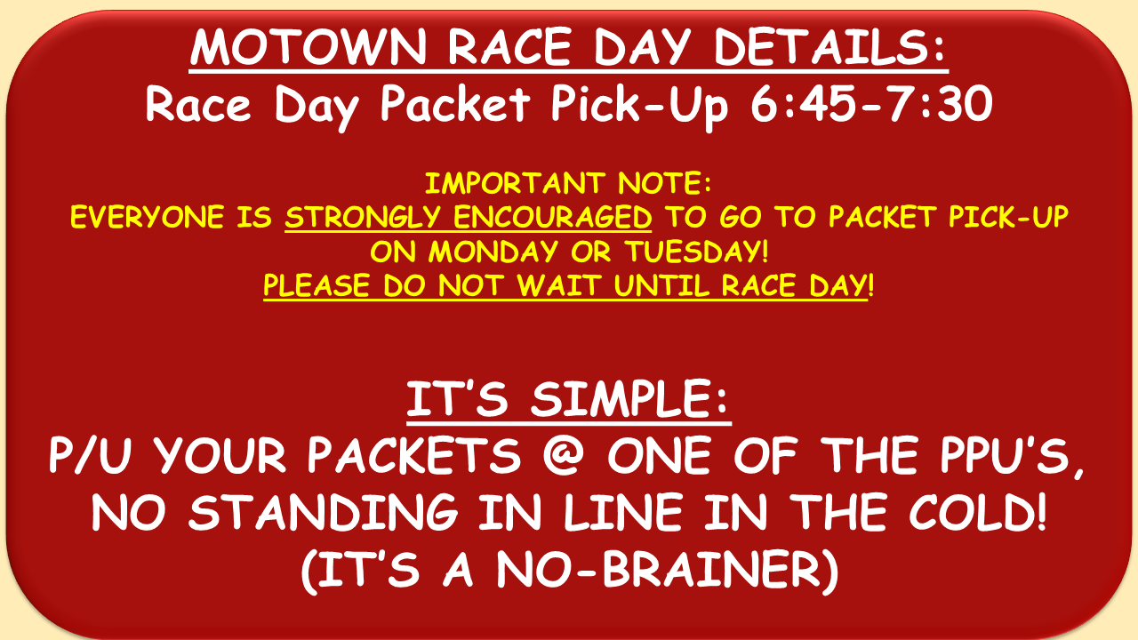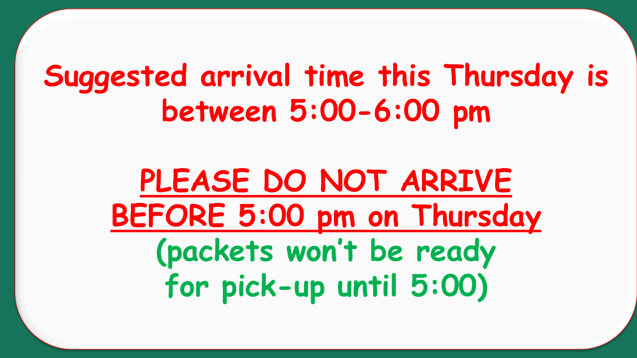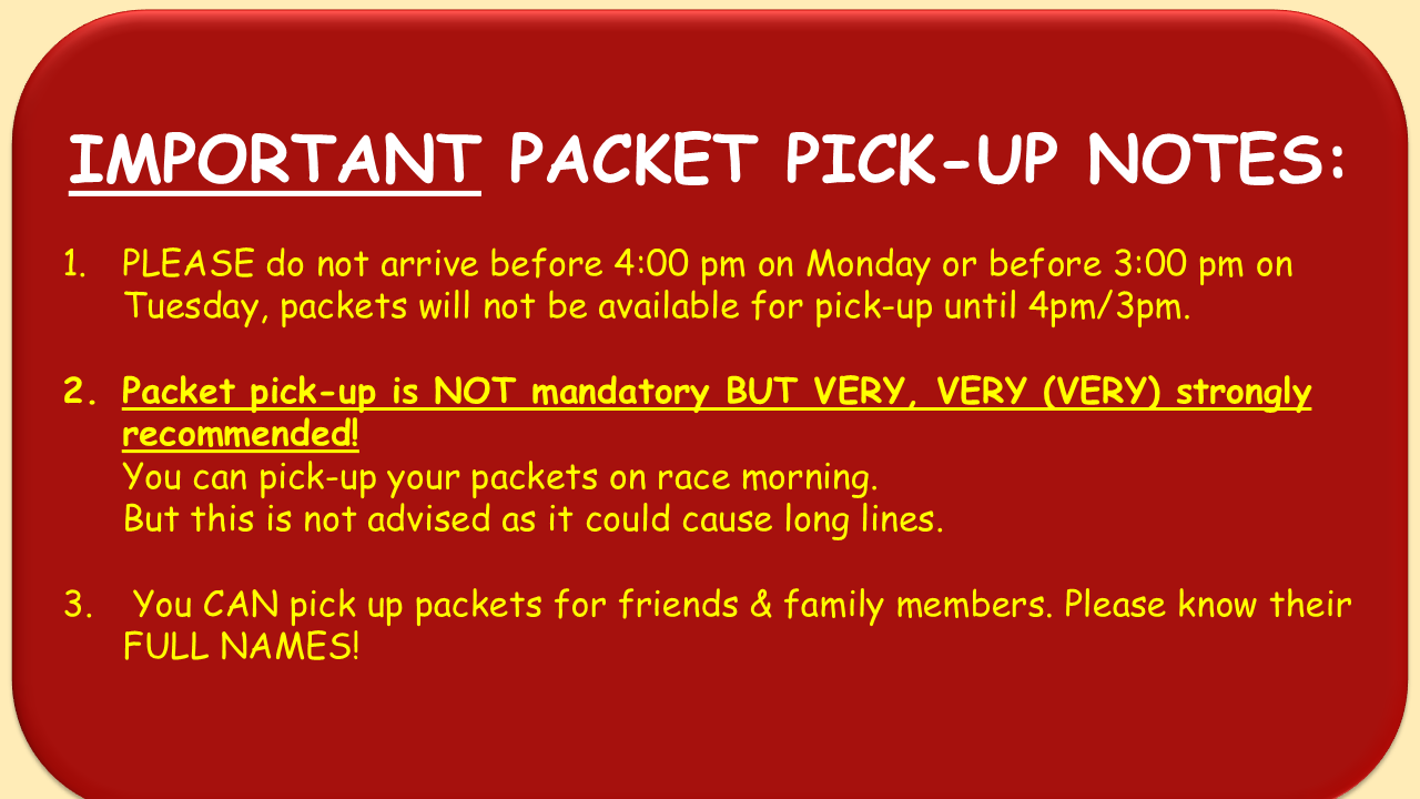 👉PLEASE do not arrive before 4:00 pm, packets will not be available for pick-up before 4:00 pm.