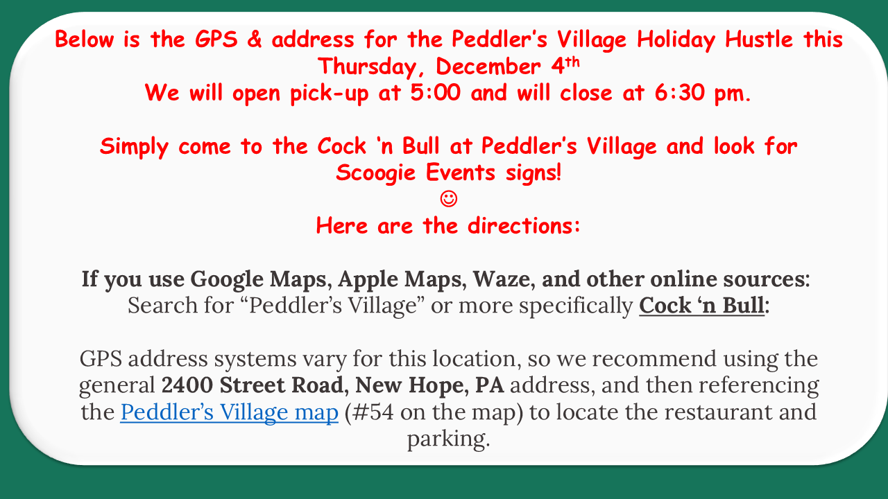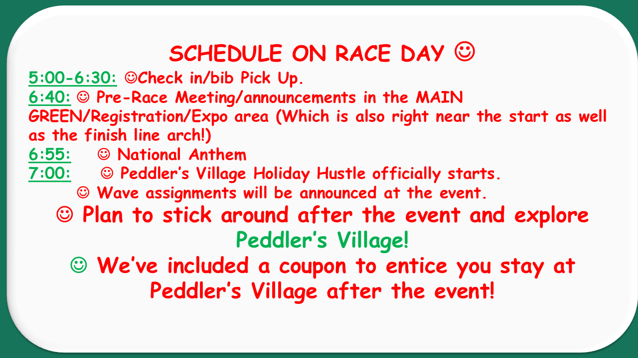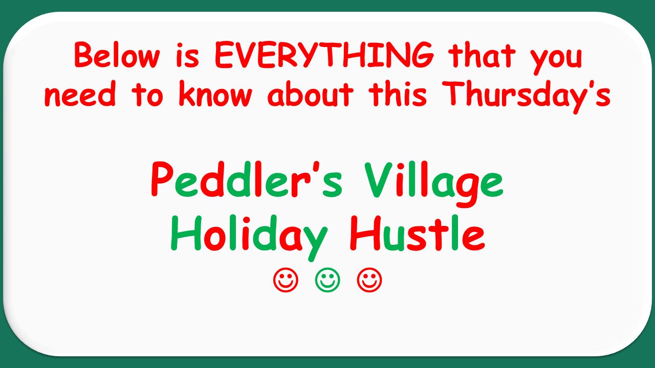 🎅Packet pick-up for the Peddler’s Village Holiday Hustle will be on Thursday, November 30, 2023 starting at 4:30 pm and closing at 6:30 pm