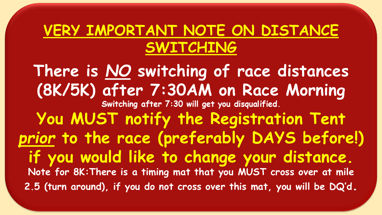 There will be no mailing of awards or shirts. If you have to leave the race early for ANY reason, you must notify us to save your award. If you do not, we cannot hold/store awards and it will likely be given to a race day entry or someone else.