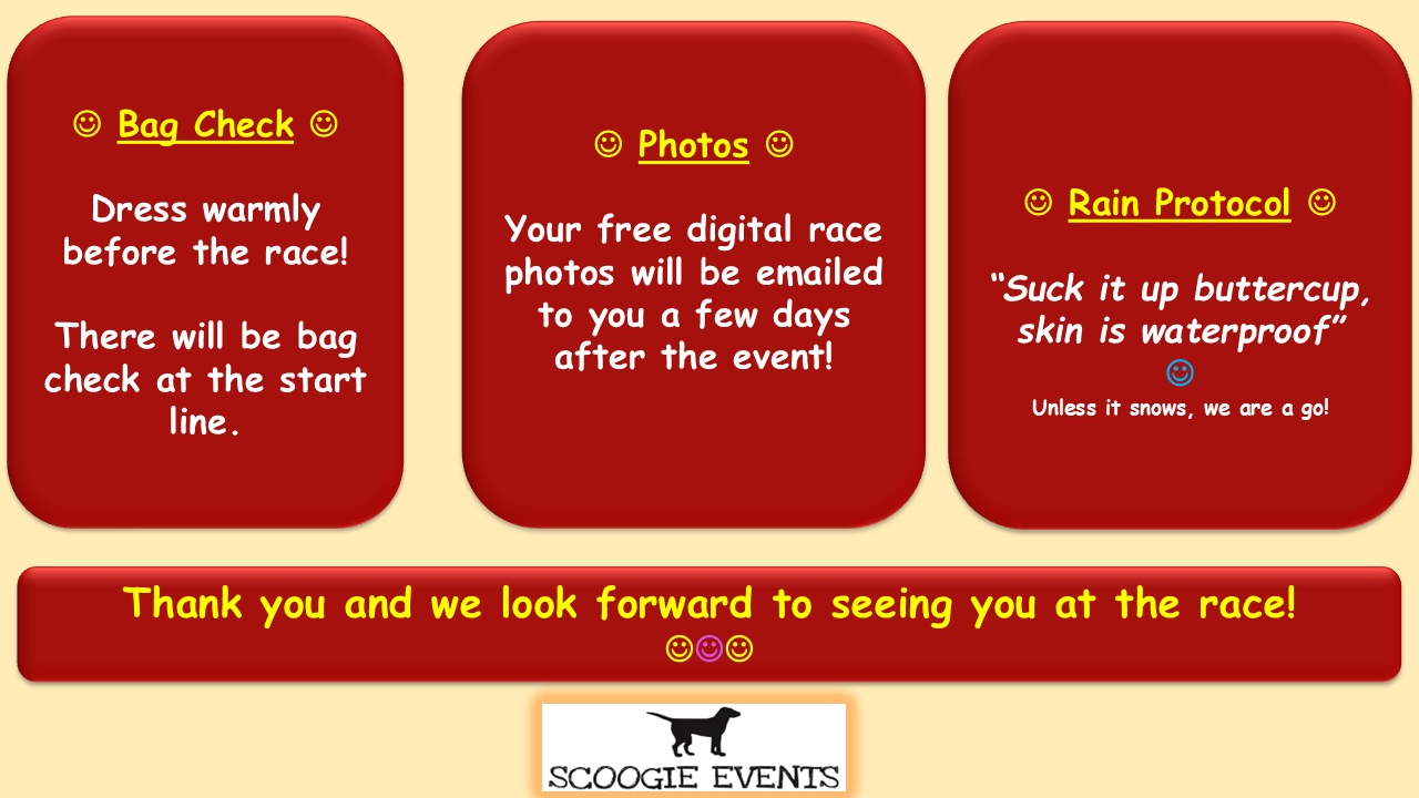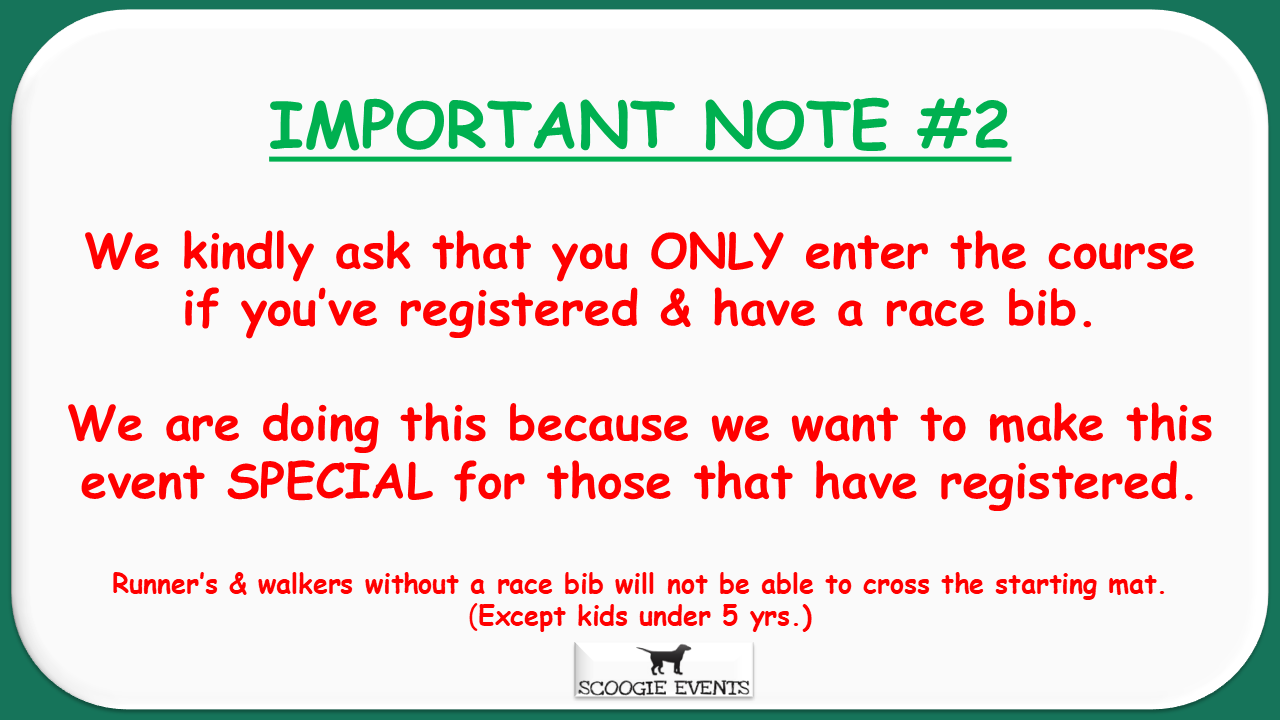 Note: If you are registered for this race and you registered in time to choose a shirt size BUT you are unable to run for whatever reason, you will NEED TO CONTACT us 24 hours BEFORE RACE DAY (we CANNOT make any changes with your registration within 24hrs of the race...we are simply too busy setting up at that time) and let us know if you'd like us to hold on to your reserved giveaway (shirt) for you to pick up at a future Scoogie Event. If you do not do this, we cannot hold your shirt and it will be given to someone that registered after the deadline. We cannot mail shirts!