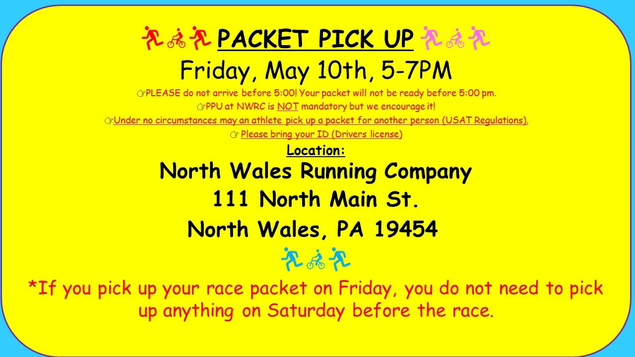 **Packet Pick up will be on FRIDAY, May 10th at NORTH WALES RUNNING COMPANY from 5-7 PM :-) A racer email will be sent out the Monday before the race detailing everything that you will need to know about packet pick up and race day details.