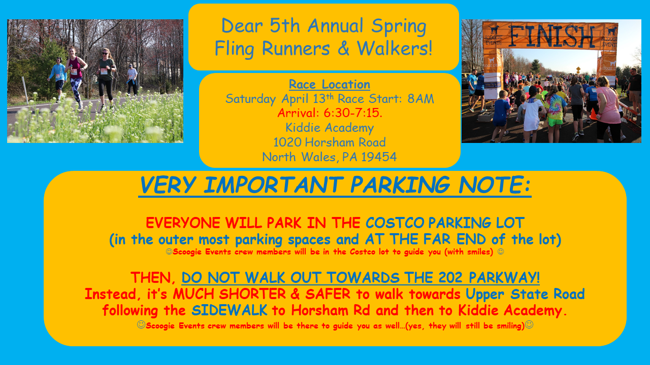 Scoogie Events & Montgomery Township cordially invite you to the Fifth Annual Spring Fling 8k & 5k run festival on April 13th ON the US 202 Parkway in North Wales! The start & finish will be ON the US 202 Parkway just up from the traffic light at Horsham Rd (Across from the historic Joseph Ambler Inn).