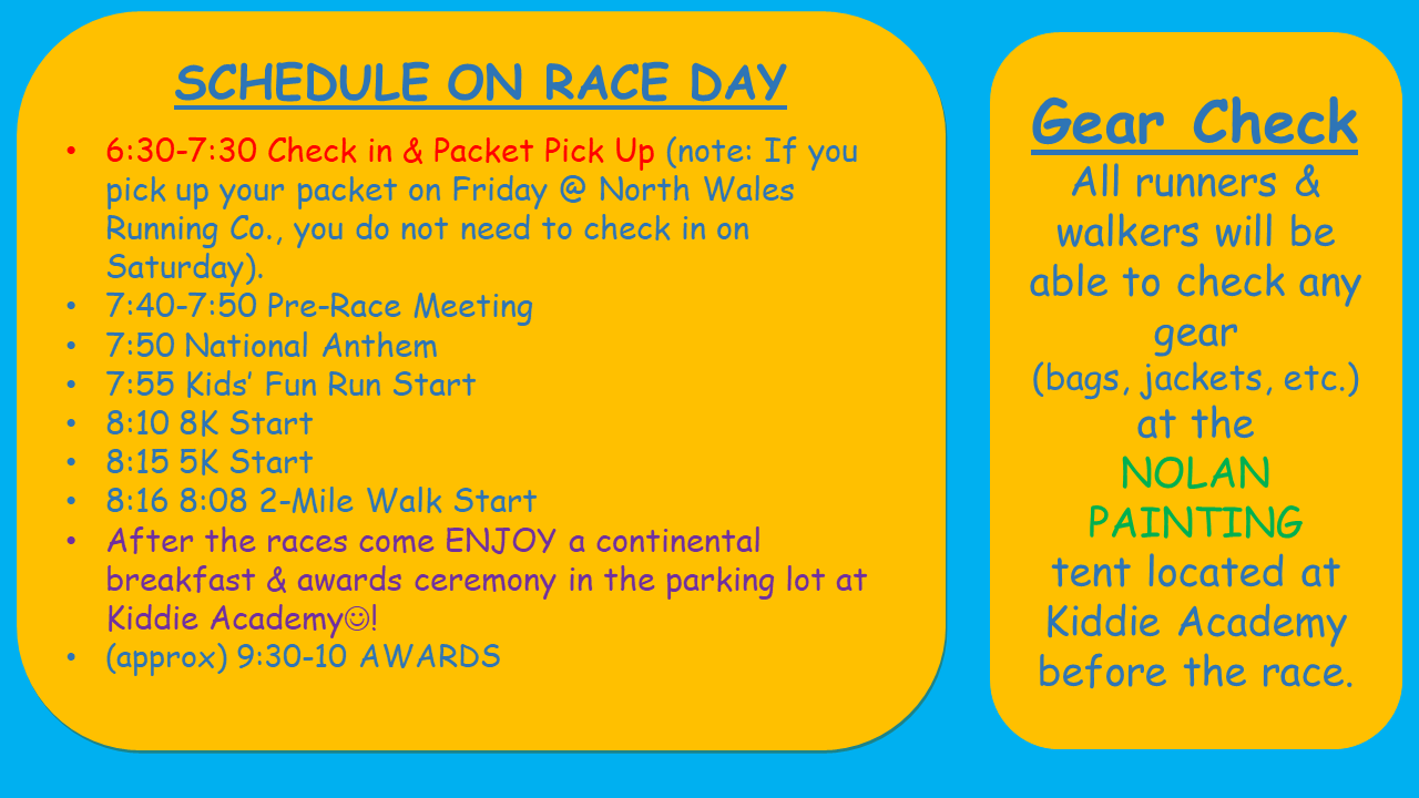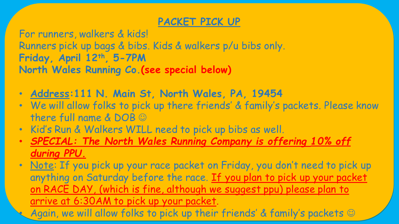 **Packet Pick up will be on FRIDAY, April 12th at NORTH WALES RUNNING COMPANY from 5-7 PM :-) A racer email will be sent out the Monday before the race detailing everything that you will need to know about packet pick up and race day details.