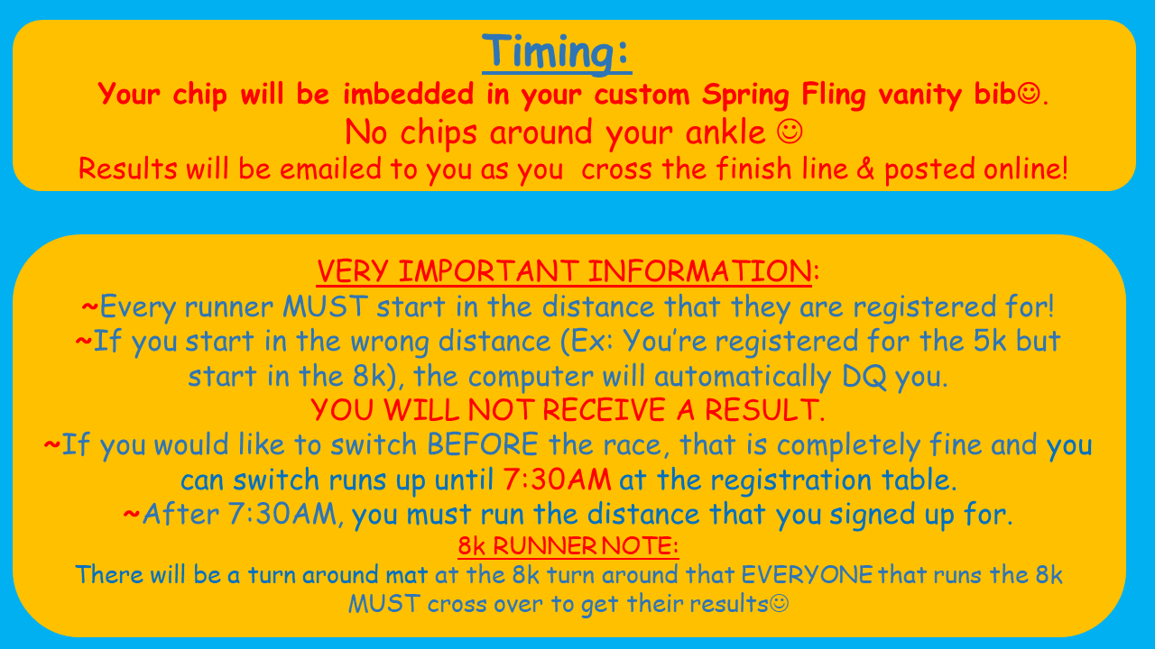 ~Special Edition Spring Fling age group awards for the top three in each age division (5 year increments!) for BOTH the 8k & 5k races.