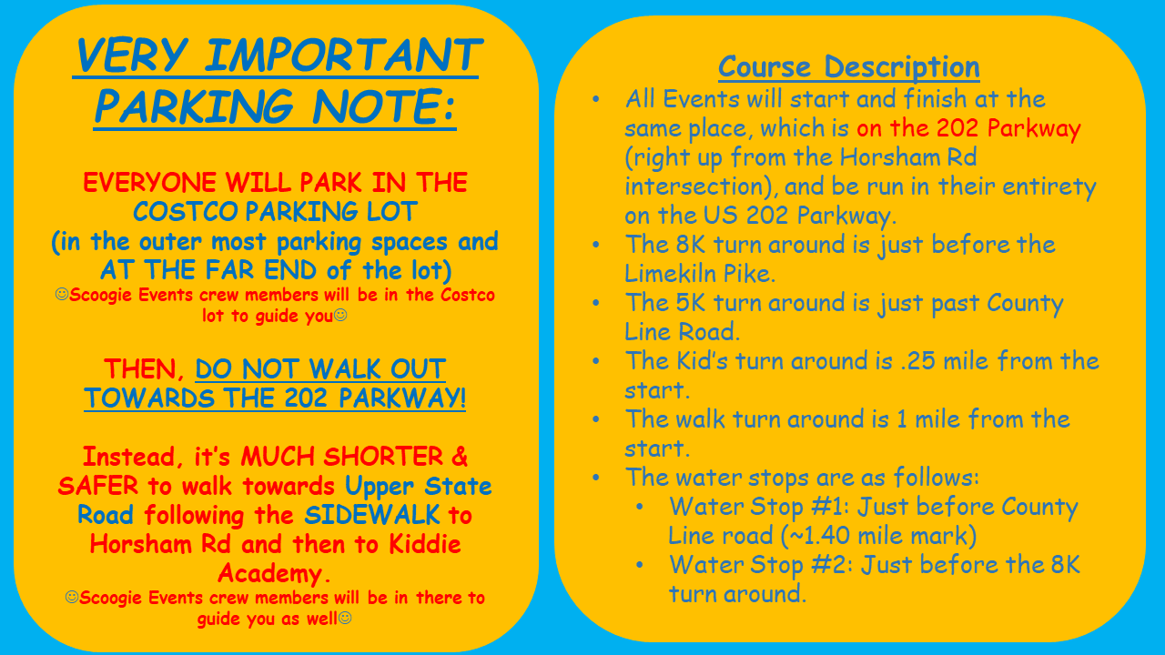 Again, the US 202 Parkway will be COMPLETELY CLOSED TO TRAFFIC for this event and all runs will be on the Parkway!!! It's THE PERFECT route for a 8k & 5k...it's beautiful, rolling and there are NO CARS!!!