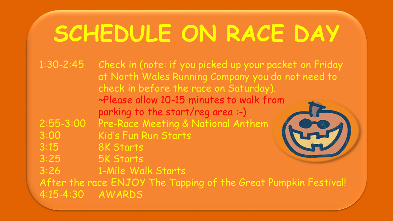 RACE DAY: Check in for 8k, 5K & Lil' Pumpkin Run participants from 1:30-2:30 pm. No new registrations taken after 2:30 pm.