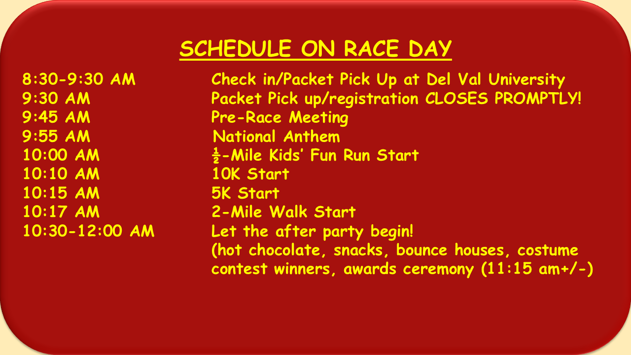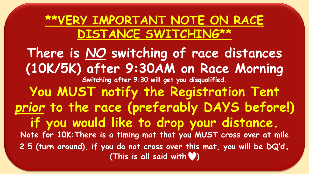 ~Packet Pick-up is NOT mandatory although it is strongly encouraged as to avoid long lines on race morning.